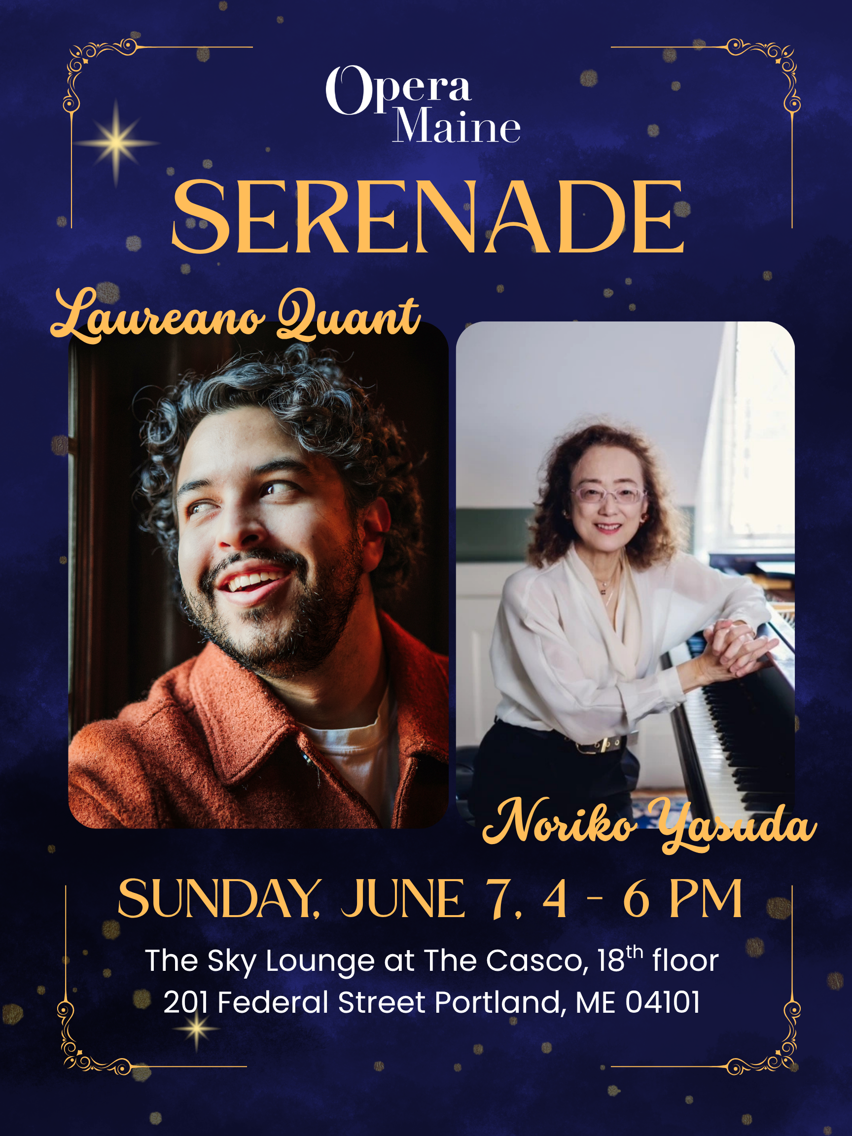 | $75Join us for this special Serenade at The Casco’s Sky Lounge featuring baritone Laureano Quant (Mercutio in our upcoming production of Roméo et Juliette) and pianist Noriko Yasuda.